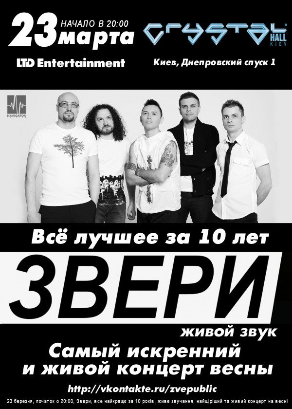 Звери відбудеться 23 березня 2012, 20:00, п’ятниця в Crystal Hall. За допомогою сервісу internet-bilet.ua, Ви зможете з легкістю забронювати, замовити та купити квитки на концерт, спектакль, оперу, балет, майстер-класи, спортивні та дитячі заходи, що Вас цікавлять, оплативши їх найбільш зручним для Вас способом: через інтернет банківською карткою VISA/MasterCard, готівкою або кур'єром, якщо зробите замовлення квитка з доставкою.