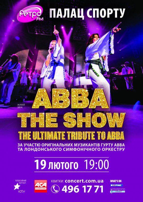 Abba The Show відбудеться 19 лютого 2012, 19:00, неділя в Палац спорту. За допомогою сервісу internet-bilet.ua, Ви зможете з легкістю забронювати, замовити та купити квитки на концерт, спектакль, оперу, балет, майстер-класи, спортивні та дитячі заходи, що Вас цікавлять, оплативши їх найбільш зручним для Вас способом: через інтернет банківською карткою VISA/MasterCard, готівкою або кур'єром, якщо зробите замовлення квитка з доставкою.