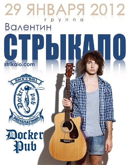 Валентин Стрыкало відбудеться 29 січня 2012, 21:30, неділя в Docker Pub. За допомогою сервісу internet-bilet.ua, Ви зможете з легкістю забронювати, замовити та купити квитки на концерт, спектакль, оперу, балет, майстер-класи, спортивні та дитячі заходи, що Вас цікавлять, оплативши їх найбільш зручним для Вас способом: через інтернет банківською карткою VISA/MasterCard, готівкою або кур'єром, якщо зробите замовлення квитка з доставкою.
