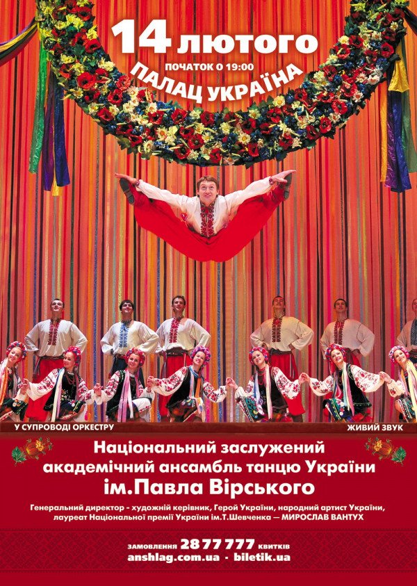 Ансамбль им.П.Вирского відбудеться 14 лютого 2012, 19:00, вівторок в Національний палац мистецтв "Україна". За допомогою сервісу internet-bilet.ua, Ви зможете з легкістю забронювати, замовити та купити квитки на концерт, спектакль, оперу, балет, майстер-класи, спортивні та дитячі заходи, що Вас цікавлять, оплативши їх найбільш зручним для Вас способом: через інтернет банківською карткою VISA/MasterCard, готівкою або кур'єром, якщо зробите замовлення квитка з доставкою.