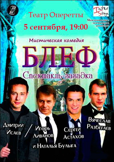 Блеф, или искушение жизнью відбудеться 5 вересня 2014, 19:00, п’ятниця в Київський національний академічний театр оперети. За допомогою сервісу internet-bilet.ua, Ви зможете з легкістю забронювати, замовити та купити квитки на концерт, спектакль, оперу, балет, майстер-класи, спортивні та дитячі заходи, що Вас цікавлять, оплативши їх найбільш зручним для Вас способом: через інтернет банківською карткою VISA/MasterCard, готівкою або кур'єром, якщо зробите замовлення квитка з доставкою.