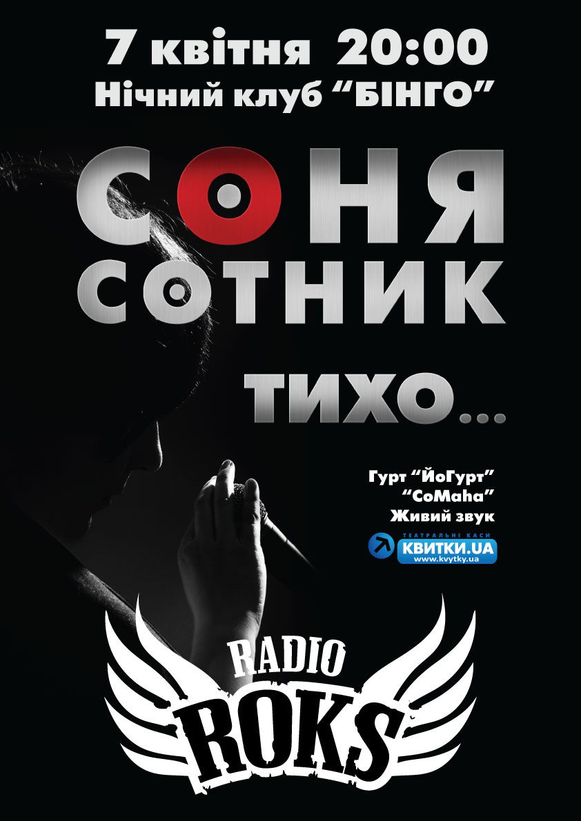 Соня Сотник відбудеться 7 квітня 2012, 20:00, субота в Bingo. За допомогою сервісу internet-bilet.ua, Ви зможете з легкістю забронювати, замовити та купити квитки на концерт, спектакль, оперу, балет, майстер-класи, спортивні та дитячі заходи, що Вас цікавлять, оплативши їх найбільш зручним для Вас способом: через інтернет банківською карткою VISA/MasterCard, готівкою або кур'єром, якщо зробите замовлення квитка з доставкою.
