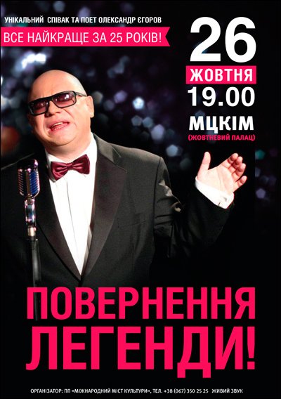 Александр Егоров «Возвращение легенды» відбудеться 26 жовтня 2014, 19:00, неділя в МЦКМ (Жовтневий Палац) . За допомогою сервісу internet-bilet.ua, Ви зможете з легкістю забронювати, замовити та купити квитки на концерт, спектакль, оперу, балет, майстер-класи, спортивні та дитячі заходи, що Вас цікавлять, оплативши їх найбільш зручним для Вас способом: через інтернет банківською карткою VISA/MasterCard, готівкою або кур'єром, якщо зробите замовлення квитка з доставкою.