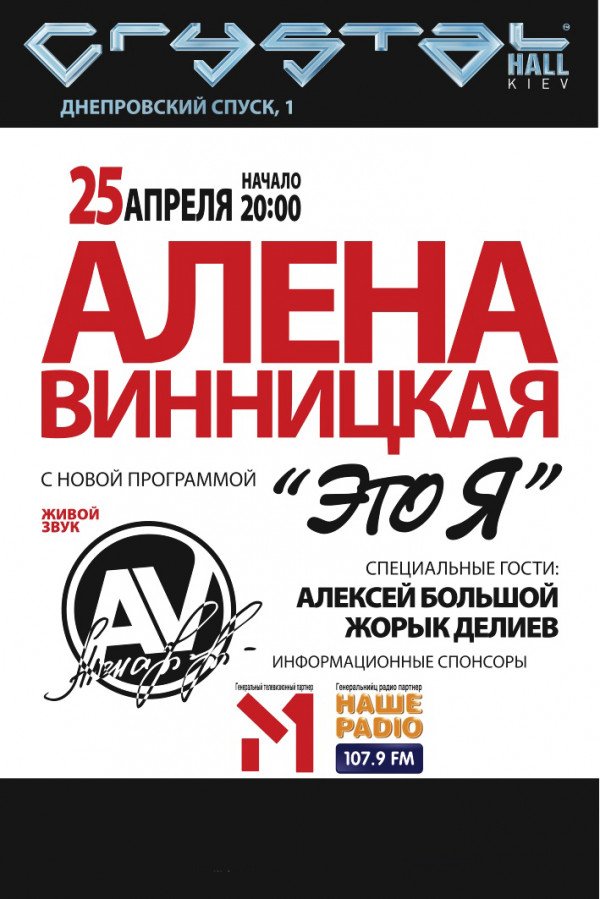 Алена Винницкая відбудеться 25 квітня 2012, 20:00, середа в Crystal Hall. За допомогою сервісу internet-bilet.ua, Ви зможете з легкістю забронювати, замовити та купити квитки на концерт, спектакль, оперу, балет, майстер-класи, спортивні та дитячі заходи, що Вас цікавлять, оплативши їх найбільш зручним для Вас способом: через інтернет банківською карткою VISA/MasterCard, готівкою або кур'єром, якщо зробите замовлення квитка з доставкою.