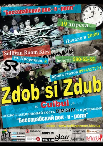 Zdob si Zdub відбудеться 19 квітня 2012, 20:00, четвер в Sullivan Room. За допомогою сервісу internet-bilet.ua, Ви зможете з легкістю забронювати, замовити та купити квитки на концерт, спектакль, оперу, балет, майстер-класи, спортивні та дитячі заходи, що Вас цікавлять, оплативши їх найбільш зручним для Вас способом: через інтернет банківською карткою VISA/MasterCard, готівкою або кур'єром, якщо зробите замовлення квитка з доставкою.