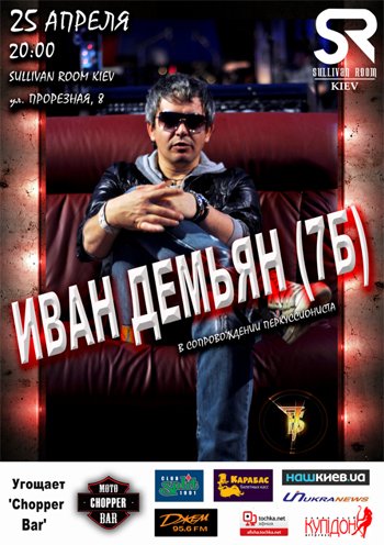 Иван Демьян. Творческий вечер відбудеться 25 квітня 2012, 20:00, середа в Sullivan Room. За допомогою сервісу internet-bilet.ua, Ви зможете з легкістю забронювати, замовити та купити квитки на концерт, спектакль, оперу, балет, майстер-класи, спортивні та дитячі заходи, що Вас цікавлять, оплативши їх найбільш зручним для Вас способом: через інтернет банківською карткою VISA/MasterCard, готівкою або кур'єром, якщо зробите замовлення квитка з доставкою.