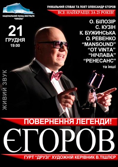 Александр Егоров «Возвращение легенды» відбудеться 21 грудня 2014, 19:00, неділя в Національний палац мистецтв "Україна". За допомогою сервісу internet-bilet.ua, Ви зможете з легкістю забронювати, замовити та купити квитки на концерт, спектакль, оперу, балет, майстер-класи, спортивні та дитячі заходи, що Вас цікавлять, оплативши їх найбільш зручним для Вас способом: через інтернет банківською карткою VISA/MasterCard, готівкою або кур'єром, якщо зробите замовлення квитка з доставкою.