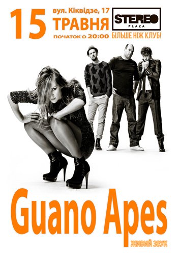 Guano Apes відбудеться 15 травня 2012, 20:00, вівторок в Stereo Plaza. За допомогою сервісу internet-bilet.ua, Ви зможете з легкістю забронювати, замовити та купити квитки на концерт, спектакль, оперу, балет, майстер-класи, спортивні та дитячі заходи, що Вас цікавлять, оплативши їх найбільш зручним для Вас способом: через інтернет банківською карткою VISA/MasterCard, готівкою або кур'єром, якщо зробите замовлення квитка з доставкою.