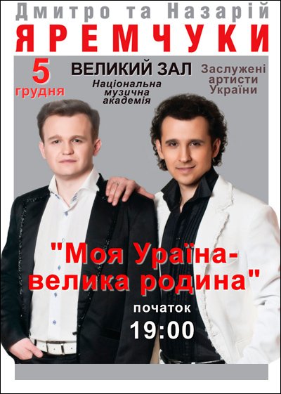 Дмитро та Назарій Яремчуки «Моя Україна - велика родина» відбудеться 5 грудня 2014, 19:00, п’ятниця в Національна музична академія України. За допомогою сервісу internet-bilet.ua, Ви зможете з легкістю забронювати, замовити та купити квитки на концерт, спектакль, оперу, балет, майстер-класи, спортивні та дитячі заходи, що Вас цікавлять, оплативши їх найбільш зручним для Вас способом: через інтернет банківською карткою VISA/MasterCard, готівкою або кур'єром, якщо зробите замовлення квитка з доставкою.