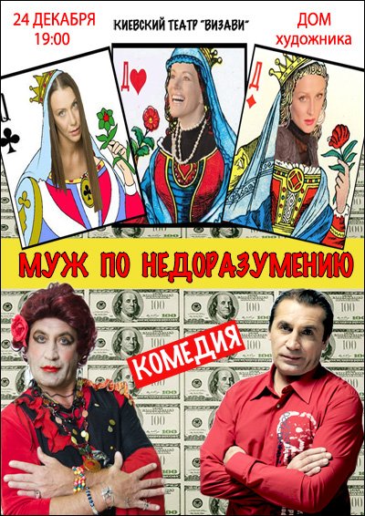 Муж по недоразумению відбудеться 24 грудня 2014, 19:00, середа в Театр "Особистості" (Центральний будинок художника). За допомогою сервісу internet-bilet.ua, Ви зможете з легкістю забронювати, замовити та купити квитки на концерт, спектакль, оперу, балет, майстер-класи, спортивні та дитячі заходи, що Вас цікавлять, оплативши їх найбільш зручним для Вас способом: через інтернет банківською карткою VISA/MasterCard, готівкою або кур'єром, якщо зробите замовлення квитка з доставкою.