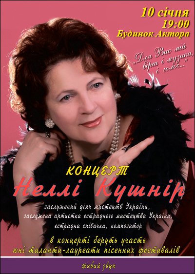 Неллі Кушнір відбудеться 10 січня 2015, 19:00, субота в Будинок Актора. За допомогою сервісу internet-bilet.ua, Ви зможете з легкістю забронювати, замовити та купити квитки на концерт, спектакль, оперу, балет, майстер-класи, спортивні та дитячі заходи, що Вас цікавлять, оплативши їх найбільш зручним для Вас способом: через інтернет банківською карткою VISA/MasterCard, готівкою або кур'єром, якщо зробите замовлення квитка з доставкою.