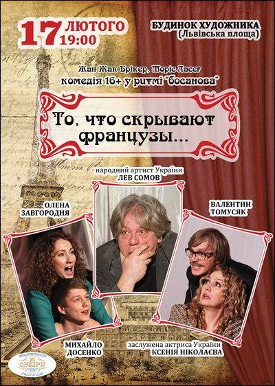 То, что скрывают французы… відбудеться 17 лютого 2015, 19:00, вівторок в Театр "Особистості" (Центральний будинок художника). За допомогою сервісу internet-bilet.ua, Ви зможете з легкістю забронювати, замовити та купити квитки на концерт, спектакль, оперу, балет, майстер-класи, спортивні та дитячі заходи, що Вас цікавлять, оплативши їх найбільш зручним для Вас способом: через інтернет банківською карткою VISA/MasterCard, готівкою або кур'єром, якщо зробите замовлення квитка з доставкою.
