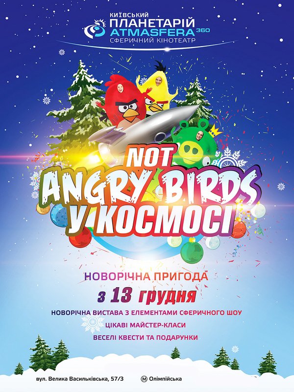 Новорічна вистава «Not Angry birds в Космосі» відбудеться 27 грудня 2014, 12:00, субота в Кинотеатр «ATMASFERA 360». За допомогою сервісу internet-bilet.ua, Ви зможете з легкістю забронювати, замовити та купити квитки на концерт, спектакль, оперу, балет, майстер-класи, спортивні та дитячі заходи, що Вас цікавлять, оплативши їх найбільш зручним для Вас способом: через інтернет банківською карткою VISA/MasterCard, готівкою або кур'єром, якщо зробите замовлення квитка з доставкою.