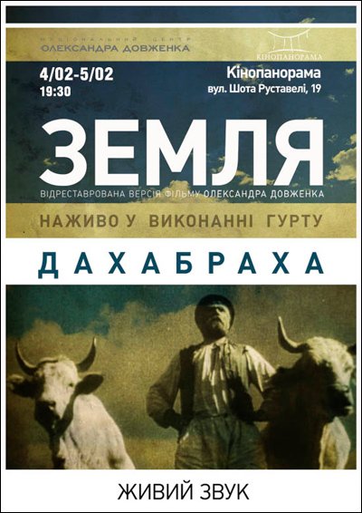Показ відреставрованого фільму «Земля» Олександра Довженка (1930 р.) в живому музичному супроводі гурту «ДахаБраха». 4-5 лютого 2015 року у кінотеатрі «Кінопанорама».