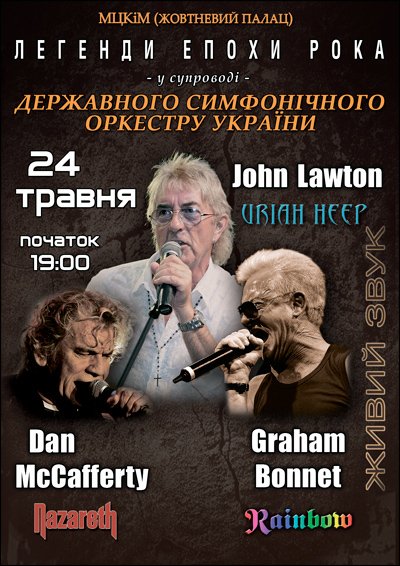 24 мая 2015 года, на сцене киевского МЦКиИ «Октябрьского Дворца» состоится незабываемый концерт «Легенды епохи рока с государственным симфоническим оркестром» с учатием таких мировых рок-звезд как: Dan McCafferty (Дэн Маккаферти), John Lawton (Джон Лаутон), Graham Bonnet (Грэм Боннет).