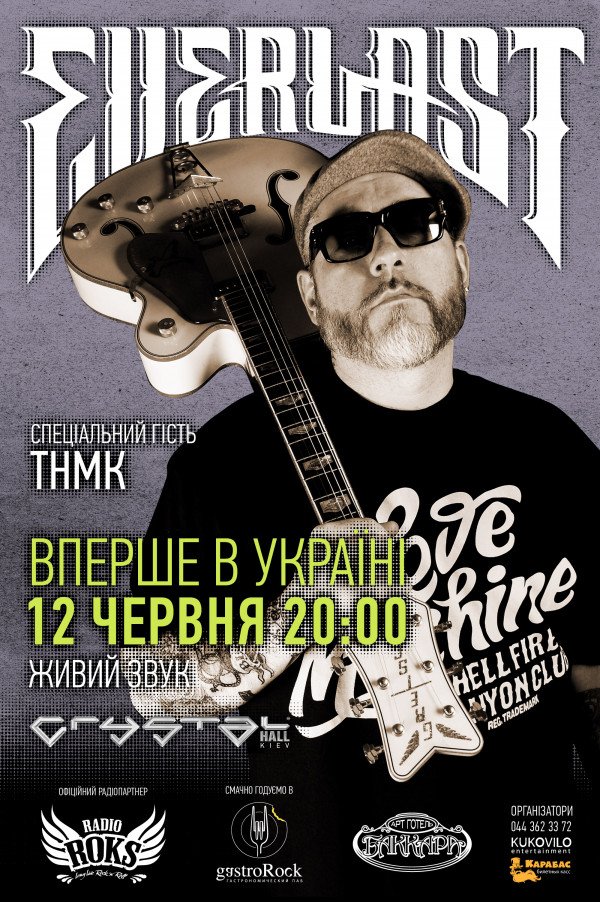 Everlast відбудеться 12 червня 2012, 20:00, вівторок в Crystal Hall. За допомогою сервісу internet-bilet.ua, Ви зможете з легкістю забронювати, замовити та купити квитки на концерт, спектакль, оперу, балет, майстер-класи, спортивні та дитячі заходи, що Вас цікавлять, оплативши їх найбільш зручним для Вас способом: через інтернет банківською карткою VISA/MasterCard, готівкою або кур'єром, якщо зробите замовлення квитка з доставкою.