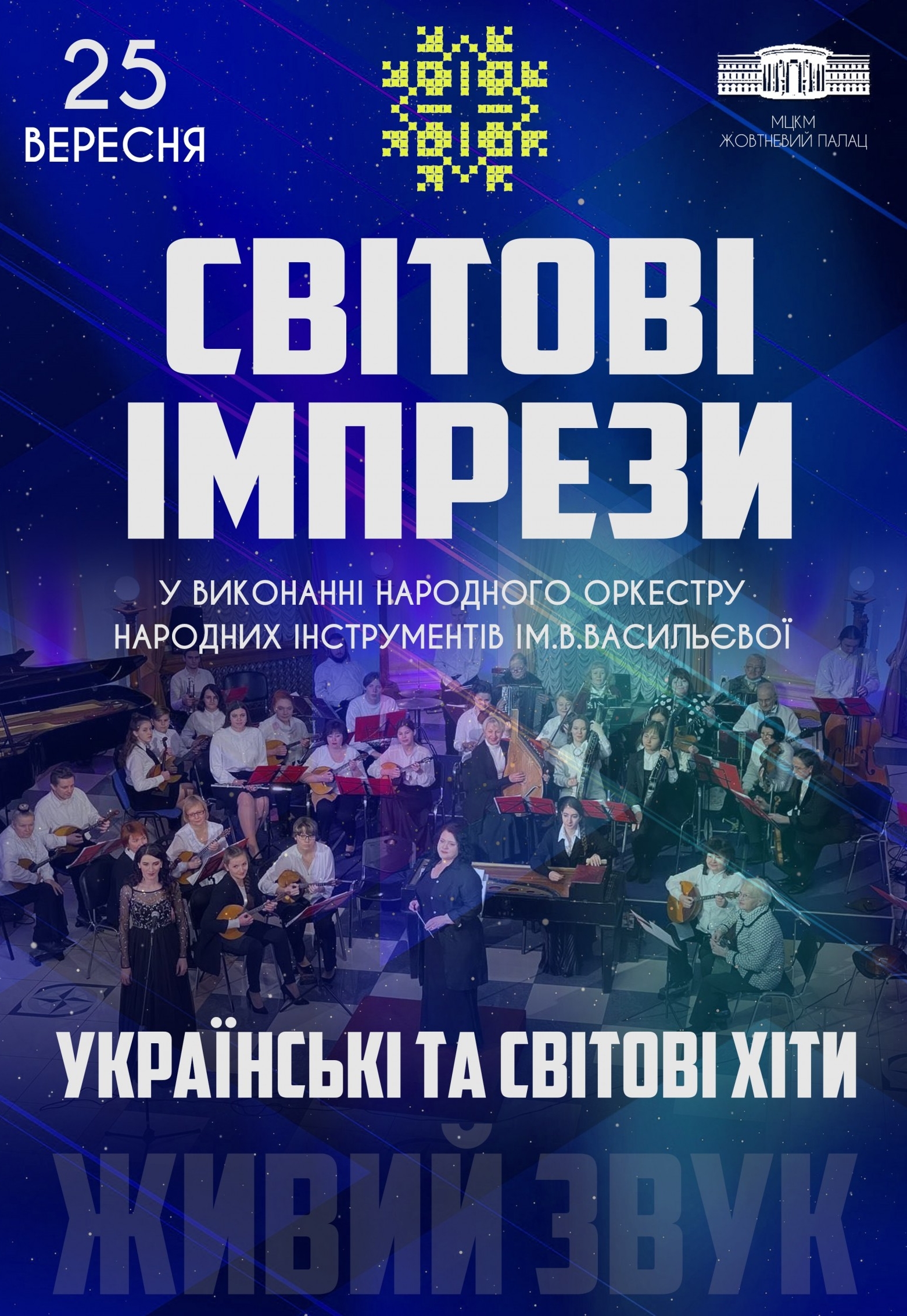 Свiтовi iмпрези відбудеться 25 вересня 2022, 17:00, неділя в МЦКМ (Жовтневий Палац) . За допомогою сервісу internet-bilet.ua, Ви зможете з легкістю забронювати, замовити та купити квитки на концерт, спектакль, оперу, балет, майстер-класи, спортивні та дитячі заходи, що Вас цікавлять, оплативши їх найбільш зручним для Вас способом: через інтернет банківською карткою VISA/MasterCard, готівкою або кур'єром, якщо зробите замовлення квитка з доставкою.