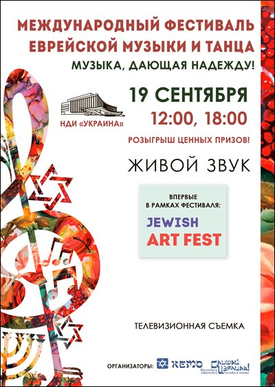 Международный фестиваль еврейской музыки и танца відбудеться 19 вересня 2015, 18:00, субота в Національний палац мистецтв "Україна". За допомогою сервісу internet-bilet.ua, Ви зможете з легкістю забронювати, замовити та купити квитки на концерт, спектакль, оперу, балет, майстер-класи, спортивні та дитячі заходи, що Вас цікавлять, оплативши їх найбільш зручним для Вас способом: через інтернет банківською карткою VISA/MasterCard, готівкою або кур'єром, якщо зробите замовлення квитка з доставкою.
