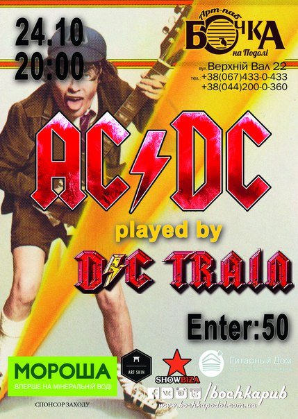 AC/DC played by D/C TRAIN відбудеться 24 жовтня 2015, 19:00, субота в Арт-Паб "Бочка". За допомогою сервісу internet-bilet.ua, Ви зможете з легкістю забронювати, замовити та купити квитки на концерт, спектакль, оперу, балет, майстер-класи, спортивні та дитячі заходи, що Вас цікавлять, оплативши їх найбільш зручним для Вас способом: через інтернет банківською карткою VISA/MasterCard, готівкою або кур'єром, якщо зробите замовлення квитка з доставкою.