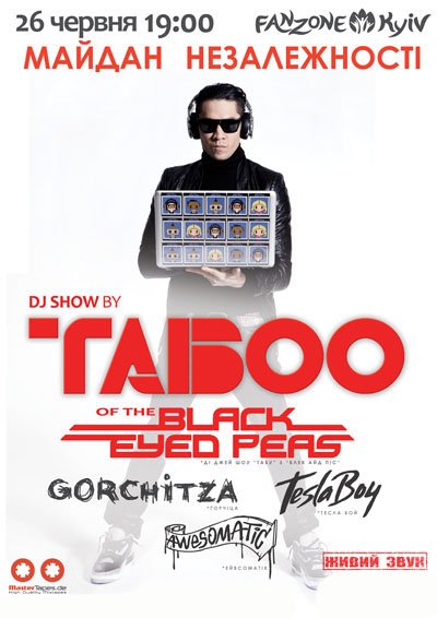 DJ SHOW by TABOO of the Black Eyed Peas (официальная фан зона Евро-2012) відбудеться 26 червня 2012, 19:00, вівторок в Майдан Незалежності. За допомогою сервісу internet-bilet.ua, Ви зможете з легкістю забронювати, замовити та купити квитки на концерт, спектакль, оперу, балет, майстер-класи, спортивні та дитячі заходи, що Вас цікавлять, оплативши їх найбільш зручним для Вас способом: через інтернет банківською карткою VISA/MasterCard, готівкою або кур'єром, якщо зробите замовлення квитка з доставкою.