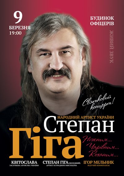 Степан Гіга відбудеться 9 березня 2016, 19:00, середа в Будинок офіцерів. За допомогою сервісу internet-bilet.ua, Ви зможете з легкістю забронювати, замовити та купити квитки на концерт, спектакль, оперу, балет, майстер-класи, спортивні та дитячі заходи, що Вас цікавлять, оплативши їх найбільш зручним для Вас способом: через інтернет банківською карткою VISA/MasterCard, готівкою або кур'єром, якщо зробите замовлення квитка з доставкою.