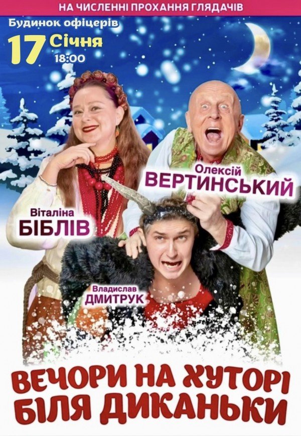 Вистава "Вечори на хуторі біля Диканьки" відбудеться 17 січня 2026, 18:00, субота в Будинок офіцерів. За допомогою сервісу internet-bilet.ua, Ви зможете з легкістю забронювати, замовити та купити квитки на концерт, спектакль, оперу, балет, майстер-класи, спортивні та дитячі заходи, що Вас цікавлять, оплативши їх найбільш зручним для Вас способом: через інтернет банківською карткою VISA/MasterCard, готівкою або кур'єром, якщо зробите замовлення квитка з доставкою.