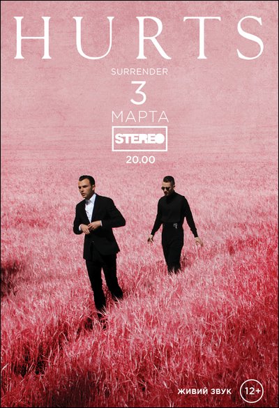 Hurts відбудеться 3 березня 2016, 20:00, четвер в Stereo Plaza. За допомогою сервісу internet-bilet.ua, Ви зможете з легкістю забронювати, замовити та купити квитки на концерт, спектакль, оперу, балет, майстер-класи, спортивні та дитячі заходи, що Вас цікавлять, оплативши їх найбільш зручним для Вас способом: через інтернет банківською карткою VISA/MasterCard, готівкою або кур'єром, якщо зробите замовлення квитка з доставкою.