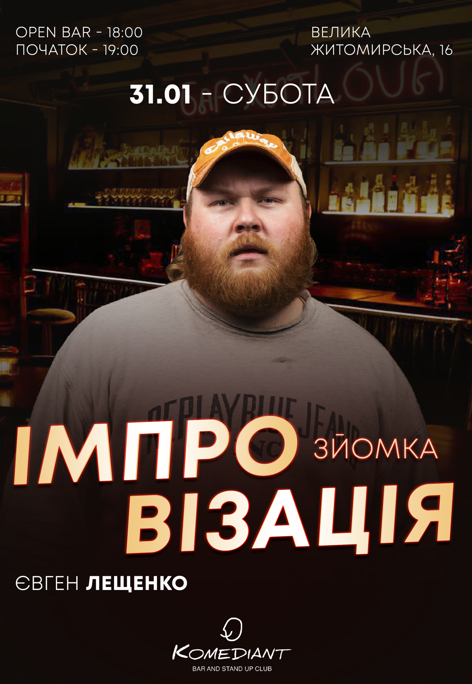 Стендап імпровізація. Євген Лещенко відбудеться 31 січня 2026, 19:00, субота в Komediant. За допомогою сервісу internet-bilet.ua, Ви зможете з легкістю забронювати, замовити та купити квитки на концерт, спектакль, оперу, балет, майстер-класи, спортивні та дитячі заходи, що Вас цікавлять, оплативши їх найбільш зручним для Вас способом: через інтернет банківською карткою VISA/MasterCard, готівкою або кур'єром, якщо зробите замовлення квитка з доставкою.
