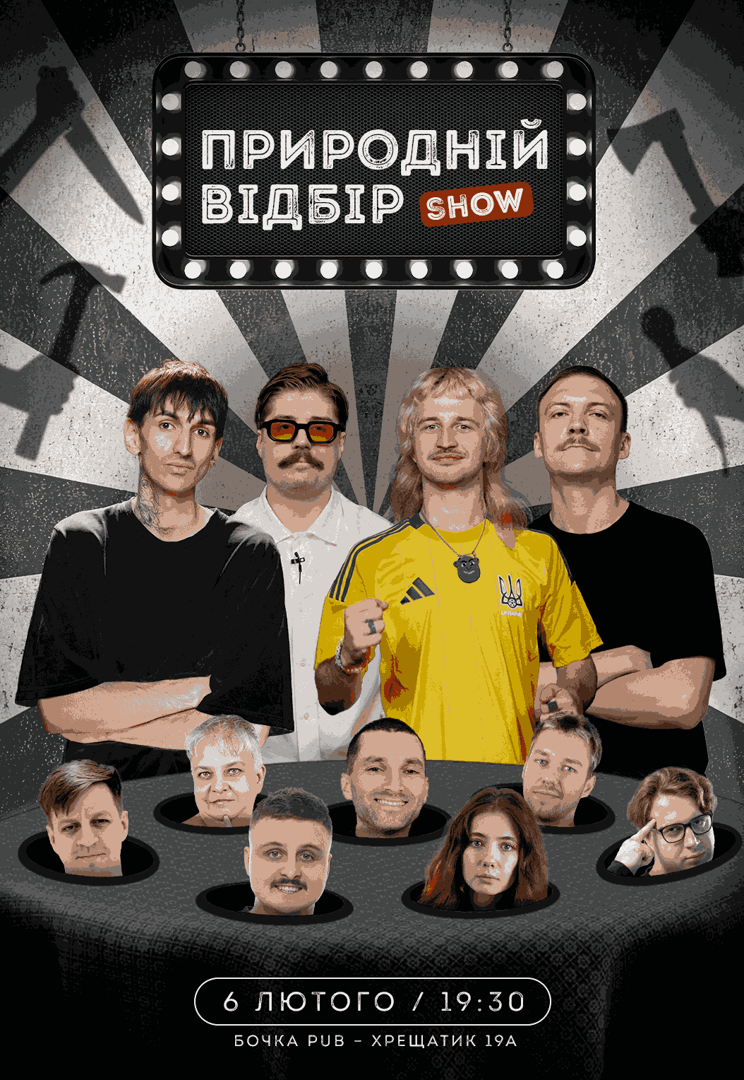 Шоу "Природній Відбір" відбудеться 6 лютого 2026, 19:30, п’ятниця в Бочка Pub. За допомогою сервісу internet-bilet.ua, Ви зможете з легкістю забронювати, замовити та купити квитки на концерт, спектакль, оперу, балет, майстер-класи, спортивні та дитячі заходи, що Вас цікавлять, оплативши їх найбільш зручним для Вас способом: через інтернет банківською карткою VISA/MasterCard, готівкою або кур'єром, якщо зробите замовлення квитка з доставкою.
