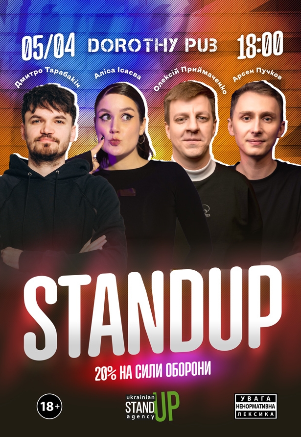 СТЕНДАП в Дороті Паб відбудеться 5 квітня 2026, 18:00, неділя в Dorothy pub. За допомогою сервісу internet-bilet.ua, Ви зможете з легкістю забронювати, замовити та купити квитки на концерт, спектакль, оперу, балет, майстер-класи, спортивні та дитячі заходи, що Вас цікавлять, оплативши їх найбільш зручним для Вас способом: через інтернет банківською карткою VISA/MasterCard, готівкою або кур'єром, якщо зробите замовлення квитка з доставкою.