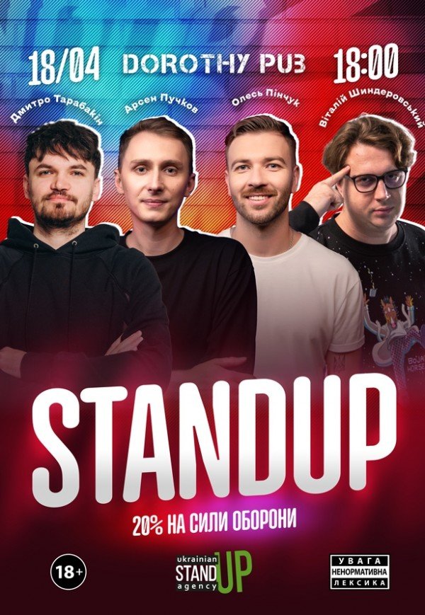 СТЕНДАП в Дороті Паб відбудеться 18 квітня 2026, 18:00, субота в Dorothy pub. За допомогою сервісу internet-bilet.ua, Ви зможете з легкістю забронювати, замовити та купити квитки на концерт, спектакль, оперу, балет, майстер-класи, спортивні та дитячі заходи, що Вас цікавлять, оплативши їх найбільш зручним для Вас способом: через інтернет банківською карткою VISA/MasterCard, готівкою або кур'єром, якщо зробите замовлення квитка з доставкою.