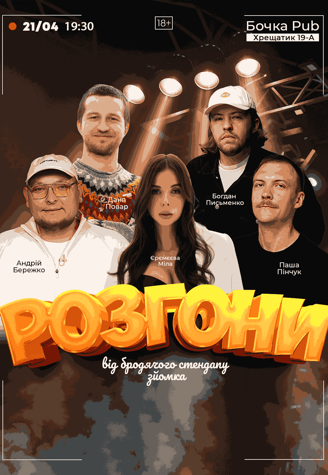 Розгони Від Бродячого Стендапу (Зйомка) відбудеться 21 квітня 2026, 19:30, вівторок в Бочка Pub. За допомогою сервісу internet-bilet.ua, Ви зможете з легкістю забронювати, замовити та купити квитки на концерт, спектакль, оперу, балет, майстер-класи, спортивні та дитячі заходи, що Вас цікавлять, оплативши їх найбільш зручним для Вас способом: через інтернет банківською карткою VISA/MasterCard, готівкою або кур'єром, якщо зробите замовлення квитка з доставкою.
