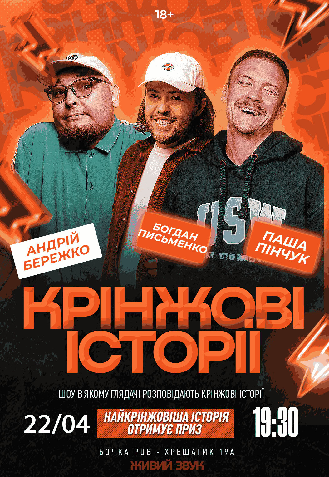 Шоу "Кринжові історії" відбудеться 22 квітня 2026, 19:30, середа в Бочка Pub. За допомогою сервісу internet-bilet.ua, Ви зможете з легкістю забронювати, замовити та купити квитки на концерт, спектакль, оперу, балет, майстер-класи, спортивні та дитячі заходи, що Вас цікавлять, оплативши їх найбільш зручним для Вас способом: через інтернет банківською карткою VISA/MasterCard, готівкою або кур'єром, якщо зробите замовлення квитка з доставкою.