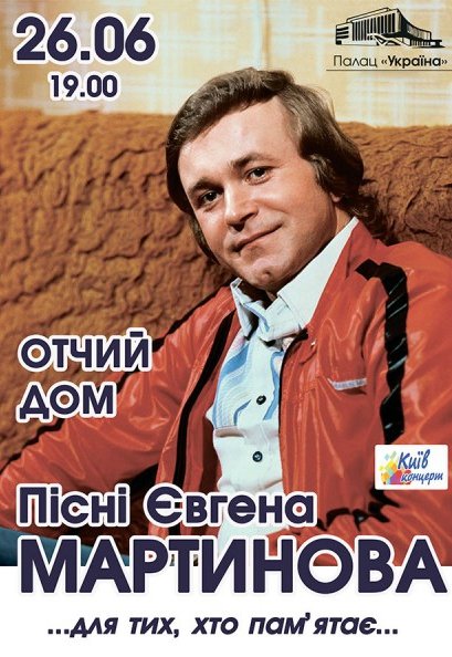 Пісні Євгена Мартинова. Для тих,хто пам'ятає... відбудеться 26 червня 2018, 19:00, вівторок в Національний палац мистецтв "Україна". За допомогою сервісу internet-bilet.ua, Ви зможете з легкістю забронювати, замовити та купити квитки на концерт, спектакль, оперу, балет, майстер-класи, спортивні та дитячі заходи, що Вас цікавлять, оплативши їх найбільш зручним для Вас способом: через інтернет банківською карткою VISA/MasterCard, готівкою або кур'єром, якщо зробите замовлення квитка з доставкою.