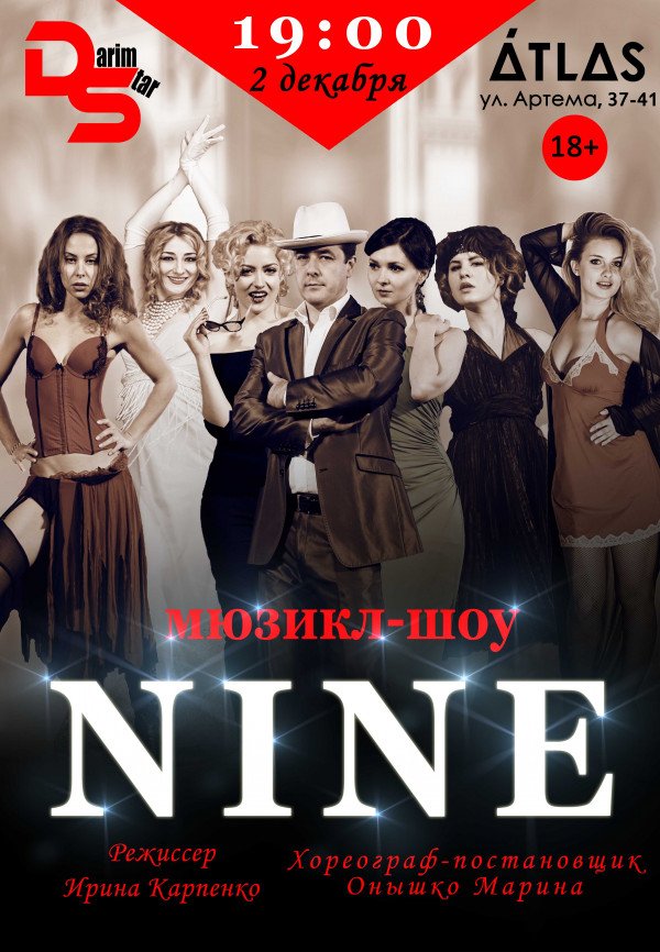Мюзикл-шоу «Nine» відбудеться 2 грудня 2015, 19:00, середа в клуб Atlas. За допомогою сервісу internet-bilet.ua, Ви зможете з легкістю забронювати, замовити та купити квитки на концерт, спектакль, оперу, балет, майстер-класи, спортивні та дитячі заходи, що Вас цікавлять, оплативши їх найбільш зручним для Вас способом: через інтернет банківською карткою VISA/MasterCard, готівкою або кур'єром, якщо зробите замовлення квитка з доставкою.