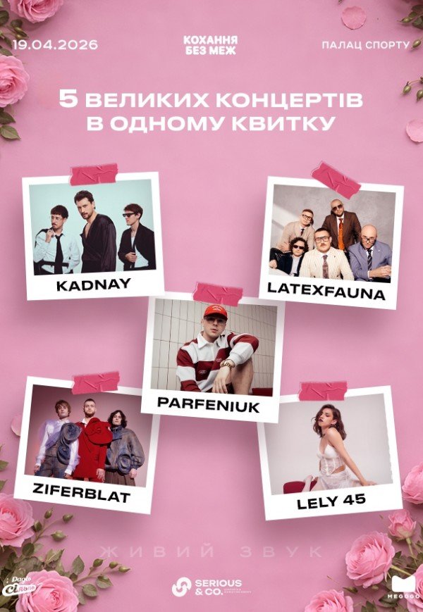 Фестиваль «Кохання без меж» з KADNAY, Latexfauna, LELY45, Ziferblat та Parfeniuk відбудеться 19 квітня 2026, 15:30, неділя в Палац спорту. За допомогою сервісу internet-bilet.ua, Ви зможете з легкістю забронювати, замовити та купити квитки на концерт, спектакль, оперу, балет, майстер-класи, спортивні та дитячі заходи, що Вас цікавлять, оплативши їх найбільш зручним для Вас способом: через інтернет банківською карткою VISA/MasterCard, готівкою або кур'єром, якщо зробите замовлення квитка з доставкою.