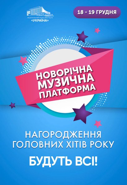Новорічна Музична Платформа відбудеться 19 грудня 2019, 19:00, четвер в Національний палац мистецтв "Україна". За допомогою сервісу internet-bilet.ua, Ви зможете з легкістю забронювати, замовити та купити квитки на концерт, спектакль, оперу, балет, майстер-класи, спортивні та дитячі заходи, що Вас цікавлять, оплативши їх найбільш зручним для Вас способом: через інтернет банківською карткою VISA/MasterCard, готівкою або кур'єром, якщо зробите замовлення квитка з доставкою.
