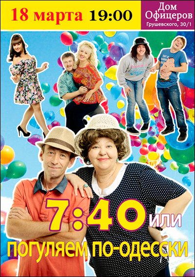 Музыкальный спектакль «7:40 или погуляем по-одесски» відбудеться 18 березня 2016, 19:00, п’ятниця в Будинок офіцерів. За допомогою сервісу internet-bilet.ua, Ви зможете з легкістю забронювати, замовити та купити квитки на концерт, спектакль, оперу, балет, майстер-класи, спортивні та дитячі заходи, що Вас цікавлять, оплативши їх найбільш зручним для Вас способом: через інтернет банківською карткою VISA/MasterCard, готівкою або кур'єром, якщо зробите замовлення квитка з доставкою.