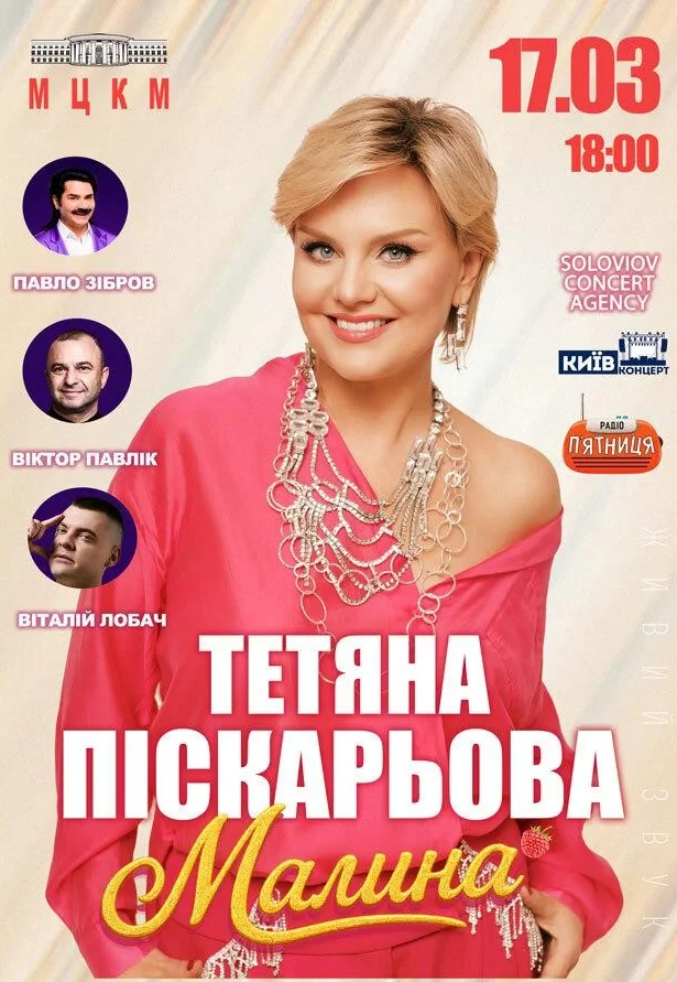 Тетяна Піскарьова відбудеться 17 березня 2026, 18:00, вівторок в МЦКМ (Жовтневий Палац) . За допомогою сервісу internet-bilet.ua, Ви зможете з легкістю забронювати, замовити та купити квитки на концерт, спектакль, оперу, балет, майстер-класи, спортивні та дитячі заходи, що Вас цікавлять, оплативши їх найбільш зручним для Вас способом: через інтернет банківською карткою VISA/MasterCard, готівкою або кур'єром, якщо зробите замовлення квитка з доставкою.