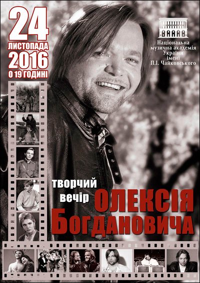 Творческий вечер Алексея Богдановича відбудеться 24 листопада 2016, 19:00, четвер в Національна музична академія України. За допомогою сервісу internet-bilet.ua, Ви зможете з легкістю забронювати, замовити та купити квитки на концерт, спектакль, оперу, балет, майстер-класи, спортивні та дитячі заходи, що Вас цікавлять, оплативши їх найбільш зручним для Вас способом: через інтернет банківською карткою VISA/MasterCard, готівкою або кур'єром, якщо зробите замовлення квитка з доставкою.