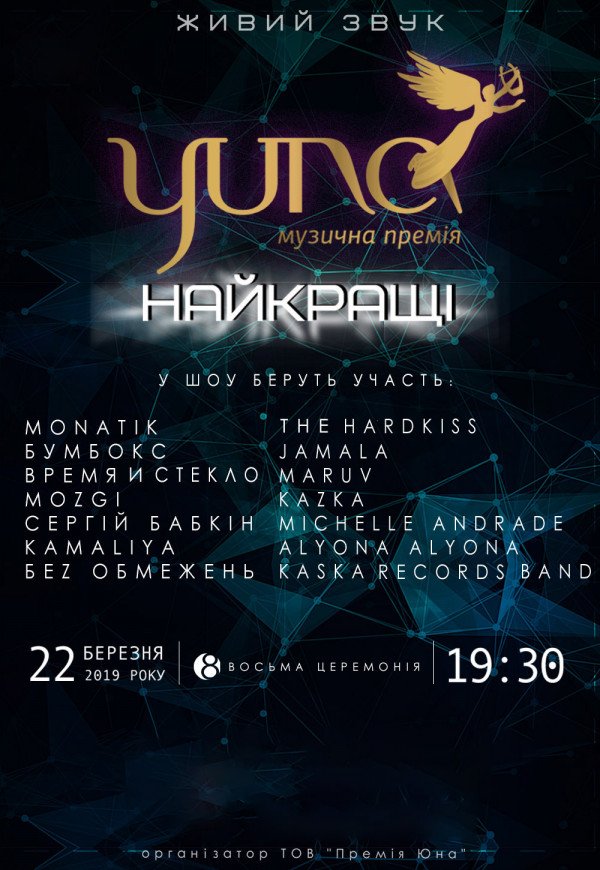 ГОЛОВНА МУЗИЧНА ЦЕРЕМОНІЯ «ПРЕМІЯ YUNA» відбудеться 22 березня 2019, 19:00, п’ятниця в Національний палац мистецтв "Україна". За допомогою сервісу internet-bilet.ua, Ви зможете з легкістю забронювати, замовити та купити квитки на концерт, спектакль, оперу, балет, майстер-класи, спортивні та дитячі заходи, що Вас цікавлять, оплативши їх найбільш зручним для Вас способом: через інтернет банківською карткою VISA/MasterCard, готівкою або кур'єром, якщо зробите замовлення квитка з доставкою.
